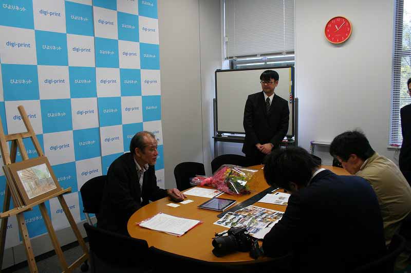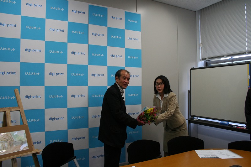 松本先生への花束贈呈のセレモニーと取材対応。この日、新聞社2社よりの取材を受けました。
